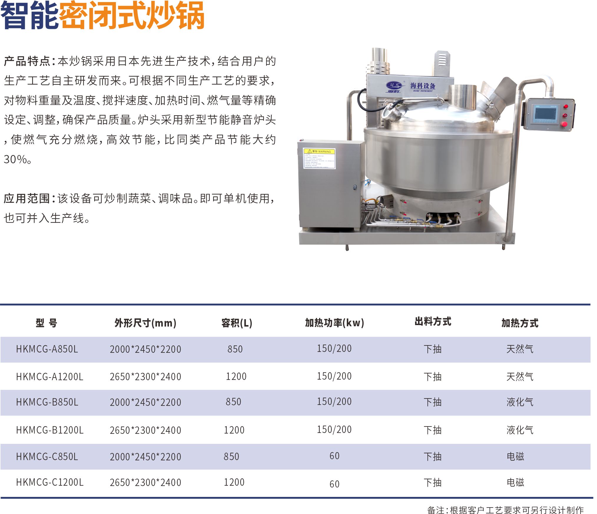 本炒鍋采用日本先進(jìn)生產(chǎn)技術(shù),結(jié)合用戶的生產(chǎn)工藝自主研發(fā)而來(lái)。可根據(jù)不同生產(chǎn)工藝的要求,對(duì)物料重量及溫度、攪拌速度、加熱時(shí)間、燃?xì)饬康染_設(shè)定、調(diào)整,確保產(chǎn)品質(zhì)量。爐頭采用新型節(jié)能靜音爐頭,使燃?xì)獬浞秩紵咝Ч?jié)能,比同類(lèi)產(chǎn)品節(jié)能大約30%。