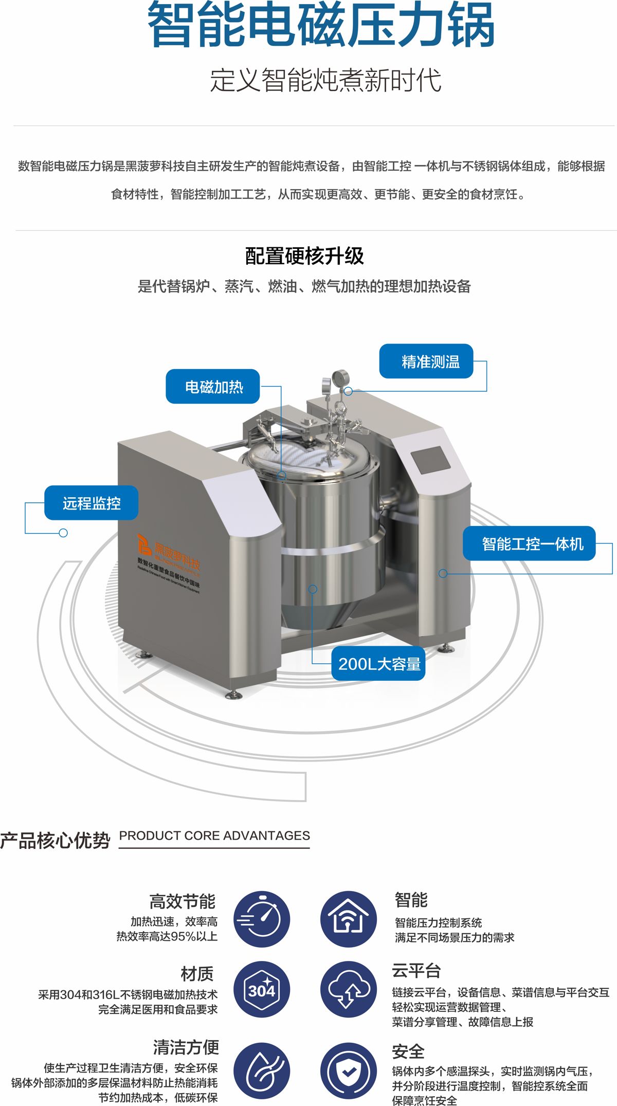 智能電磁壓力鍋采用最新的304不銹鋼電磁加熱技術(shù),集智能控溫、智能控壓、智能云配方、智能配料等功能于一體。適用于大型中央廚房、機(jī)關(guān)及企業(yè)食堂燉蒸煮、燉湯、熬粥、燒菜等多種加工需求。